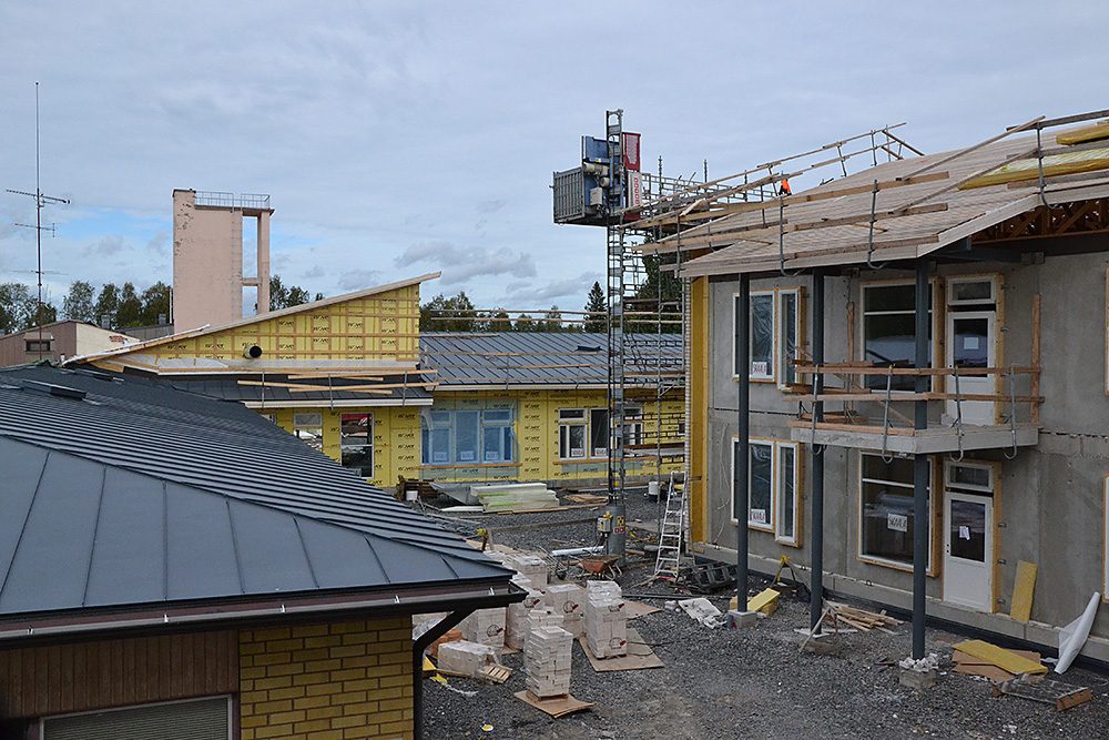 Vimpelissä rakennetaan vilkkaasti ja aikataulussa pysyen palvelukeskusta, joka käsittää uuden 36-paikkaisen asumispalveluyksikön rakentamisen sekä Toimelaa, Niikoolia ja terveysasemaa koskevaa saneerausta. Vimpelin katukuvaa jo muuttaneesta urakasta on valmiina on yli puolet. Valmista on 31.1.2015. Kuva on otettu rakenteilla olevan uuden asumispalveluyksikön toisesta kerroksesta. Monelle tuttuja maamerkkejä ovat vasemman alakulman Niikooli sekä takana kohoavan vanhan paloaseman torni.