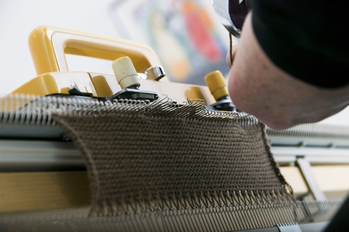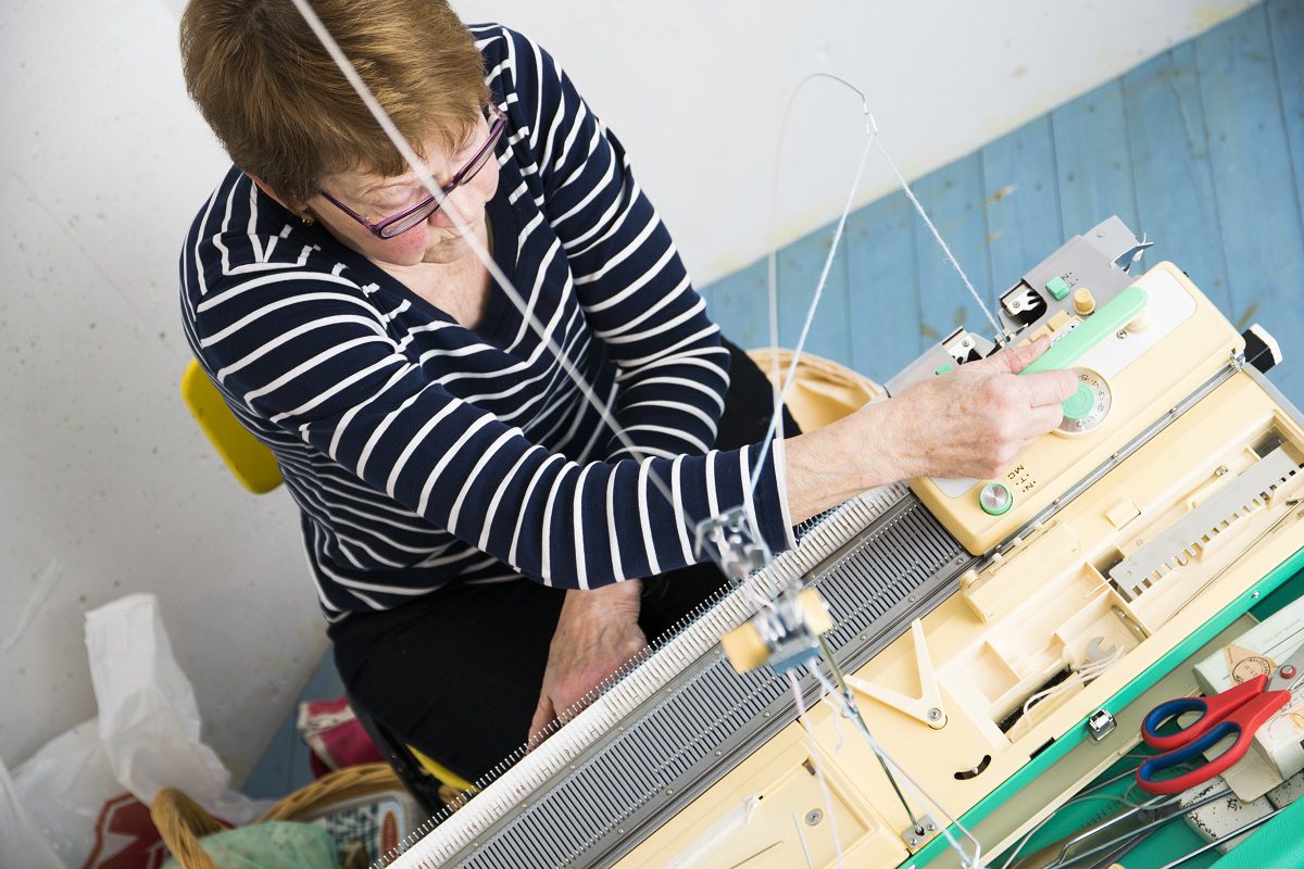 Anja Niemi neuloo kauluria lapselle käsikäyttöisellä neulekoneella.
