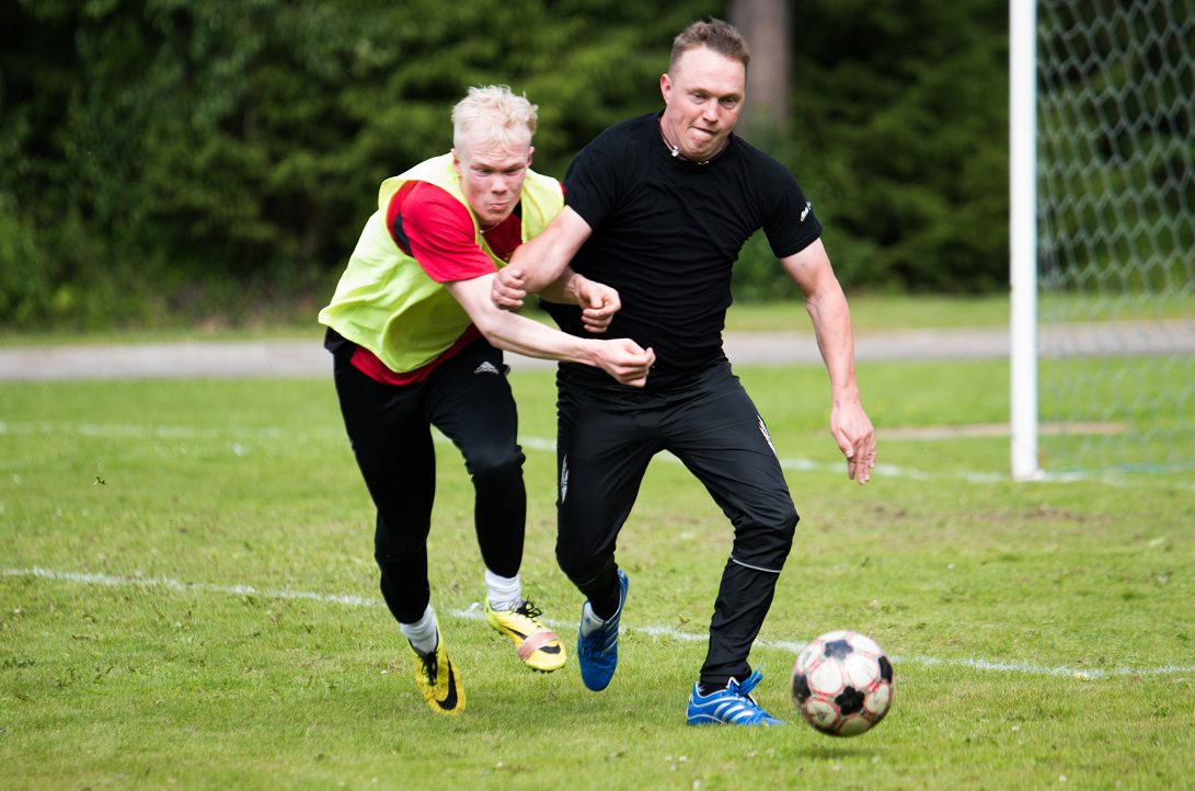 Manu Mäkelä (vas.) ja Mikko Saarijärvi kamppailivat pallosta entisten (keltaliivinen joukkue) ja nykyisten evijärveläisten välisessä jalkapallo-ottelussa markkinalauantaina. Ottelu päättyi entisten evijärveläisten 2–0-jaksovoittoon.