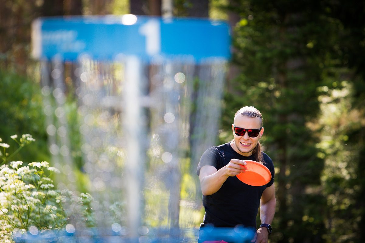 Perjantai-iltana 28.6. järjestettiin frisbeegolfkilpailu Nissinkankaan radalla. Kuvassa puttasi kokkolalainen Tuomo Heiskanen. Hän edustaa joensuulaista Joen Liitokiekko -nimistä frisbeegolf- ja ultimateseuraa.