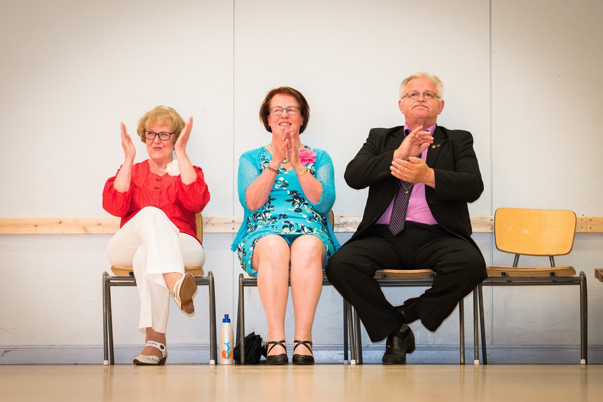 Vaimokullan ja armaan anopin näyttelijät: takarivissä Minttu Kangasmetsä, Jaana Muukka, Mauno Puotinen ja Anne Pesonen (yhä rooliasussa). Eturivissä Teemu Kauris, Elina Ketomäki ja Ritva Kangas.