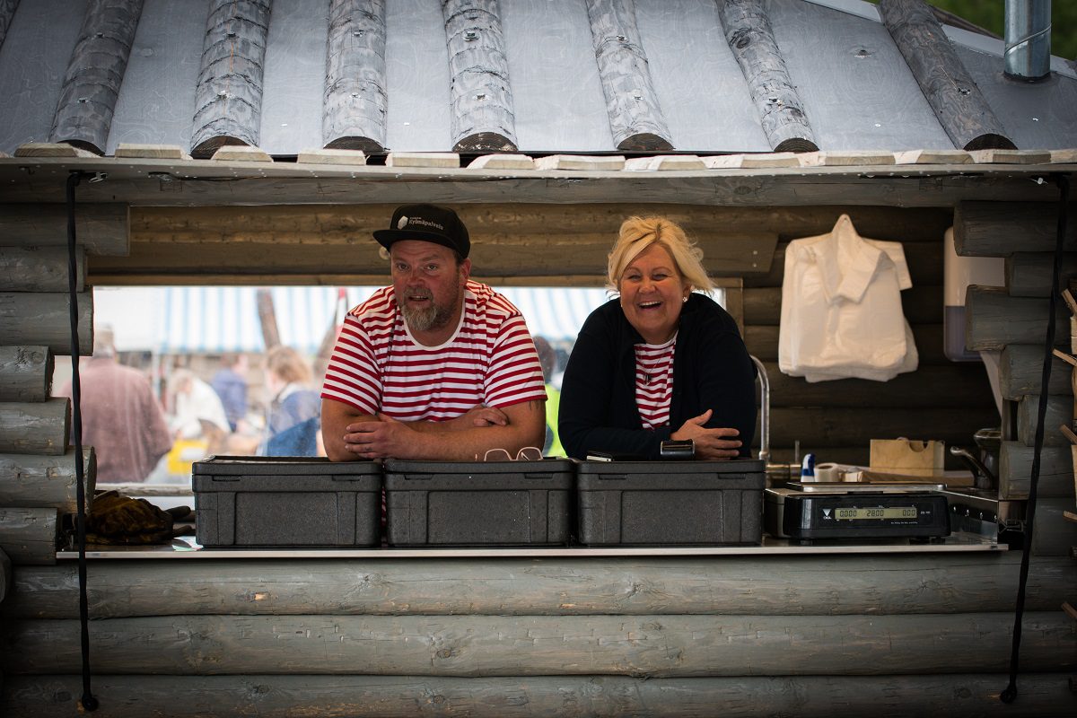 Tommi ja Jaana Tapanimäki myivät savukalaa. Anssi Söderlingin veistämä hirsinen myyntikoppi oli markkinoilla neitsytmatkallaan.