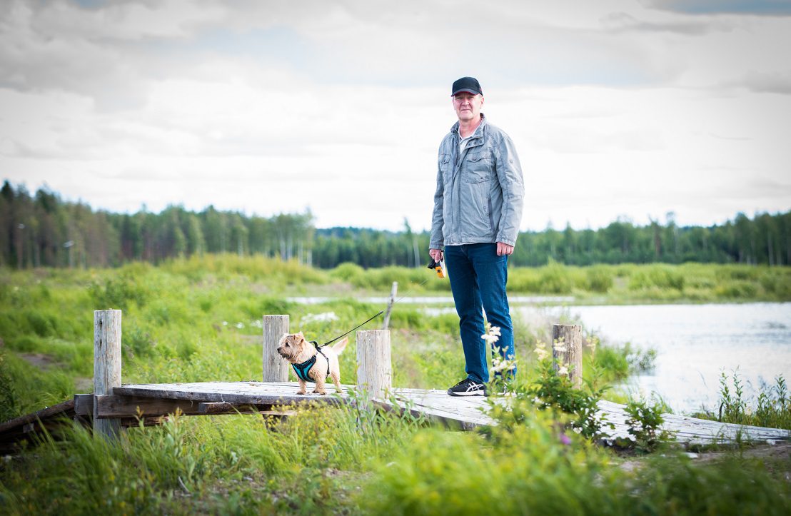 Jyrki Kujala ja Nero-koira patikoivat maanantai-iltana 1.7. Särkikylän kosteikolla. Kyläläisiä oli kokoontunut istumaan iltaa laavulle.