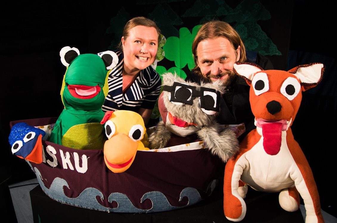 Vaasalainen lastenteatteri Soiva Sammakko esiintyi kirjastossa maanantaina. ”Soiva Sammakko ja seikkailu lammella” oli uudelleenlämmitelty ensimmäinen osa teatterin nimikkohahmon tarinaa. Se kertoi ystävyyden eri muodoista, yksinäisyydestä ja erilaisuuden hyväksymisestä. Kuvassa Pia Leinonen ja Joni Tiala. Esityksen on ohjannut Sarah Bergkulla.