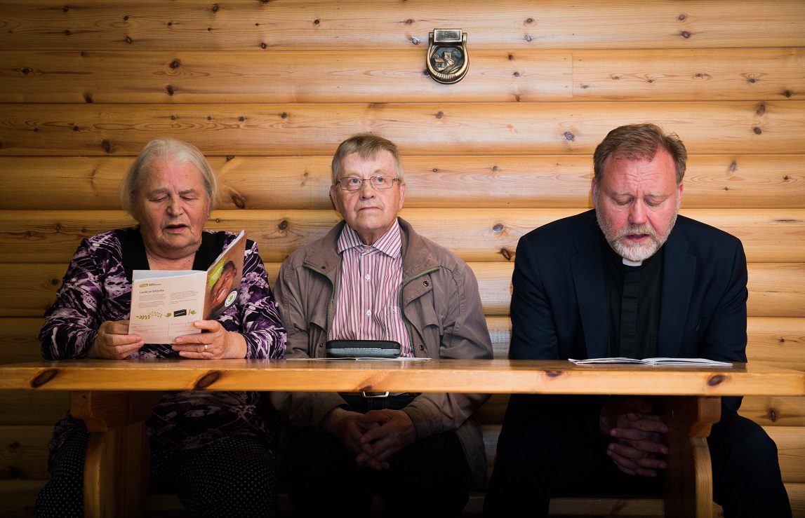 Seurakunta järjesti Evijärvi-viikon aikana useamman yhteislaulutilaisuuden eri puolilla pitäjää. Kuvassa Jokikylän kylätalolla lauloivat kirkkoherra Aki Paavolan (oik.) vierellä Aune ja Väinö Mannermaa. Säestyksestä vastasi kanttori Aira Kentala.