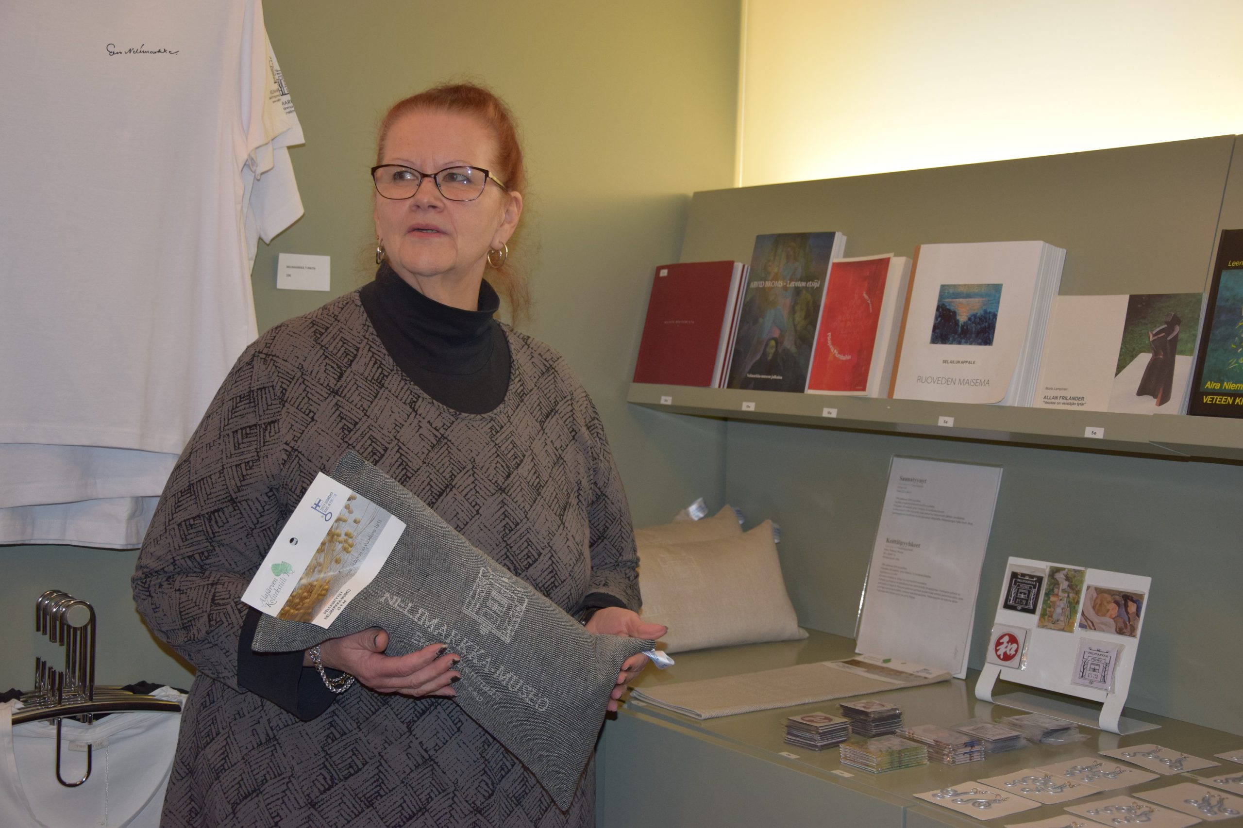 TARJA Ahopelto hoitaa vastaanottoa ja myymälän kassaa, tekee mediaseurantaa ja siivoaa. –Tarja tietää kaikesta kaiken, hänellä on hyviä neuvoja ripustustilanteissa, ja hän on vastaanoton valtiatar, työkaverit luonnehtivat.
