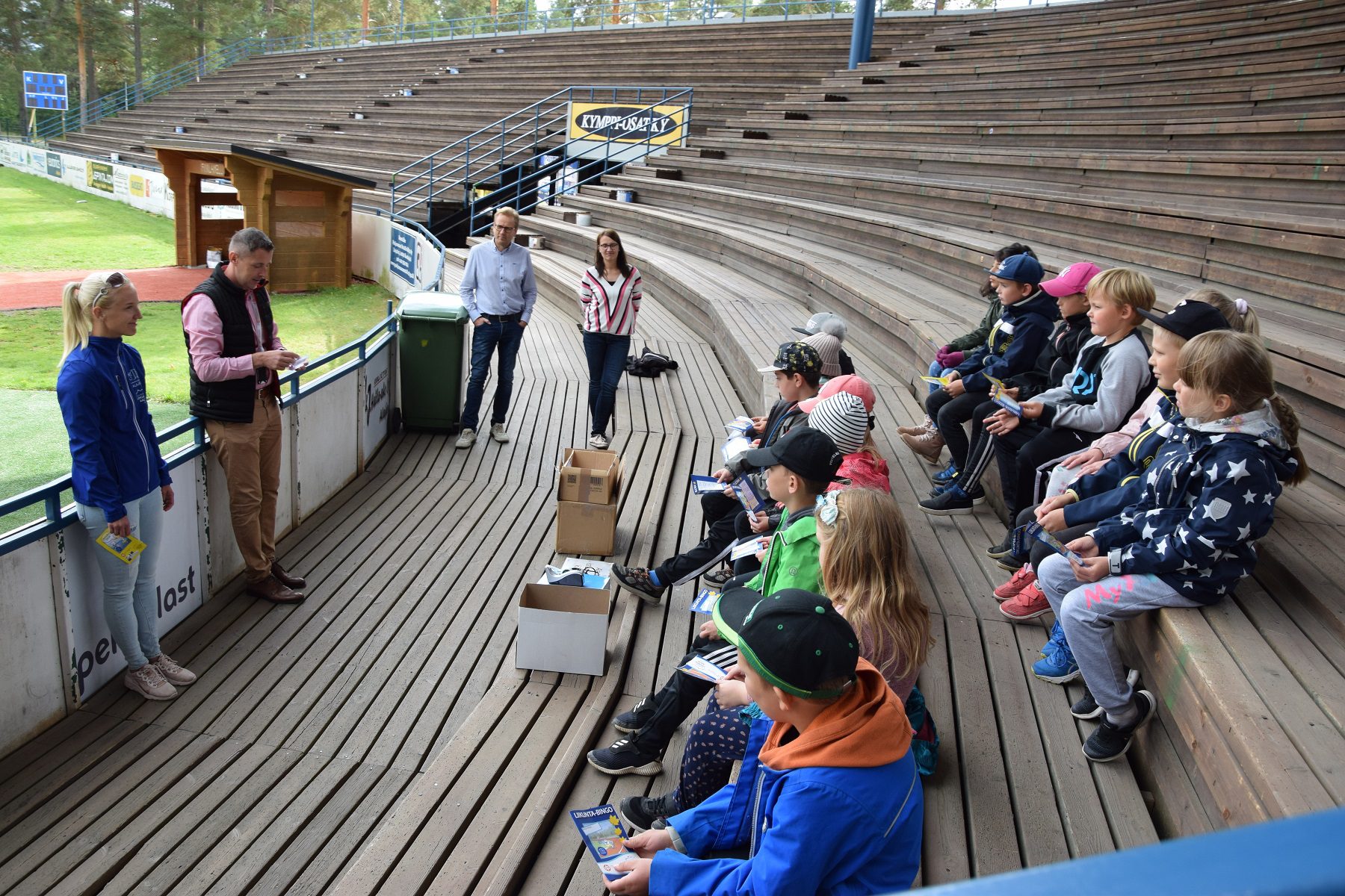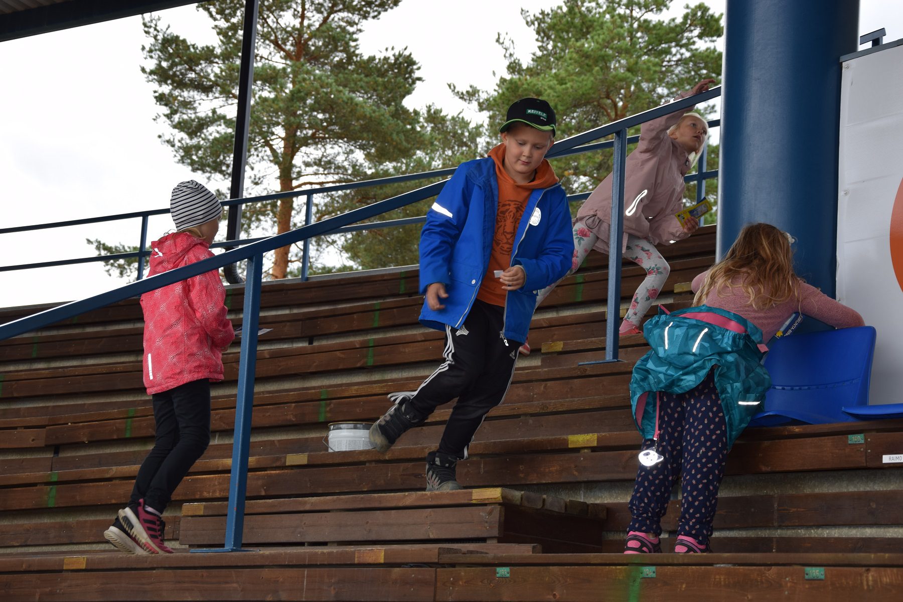 Liikunta-Aallon projektipäällikkö Henna Matintuvan ja Paavolan Liikkuvan koulun vastaavan opettajan Elina Hännisen suunnittelemassa bingossa ei siis tarvita onnea, vaan jokainen voi itse valita mieleisensä liikuntatehtävät. Yhden rasteista, kuntoile portaissa, 2A-luokka suoritti heti yhdessä keräämällä Kitron stadionille piilotettuja tarroja.