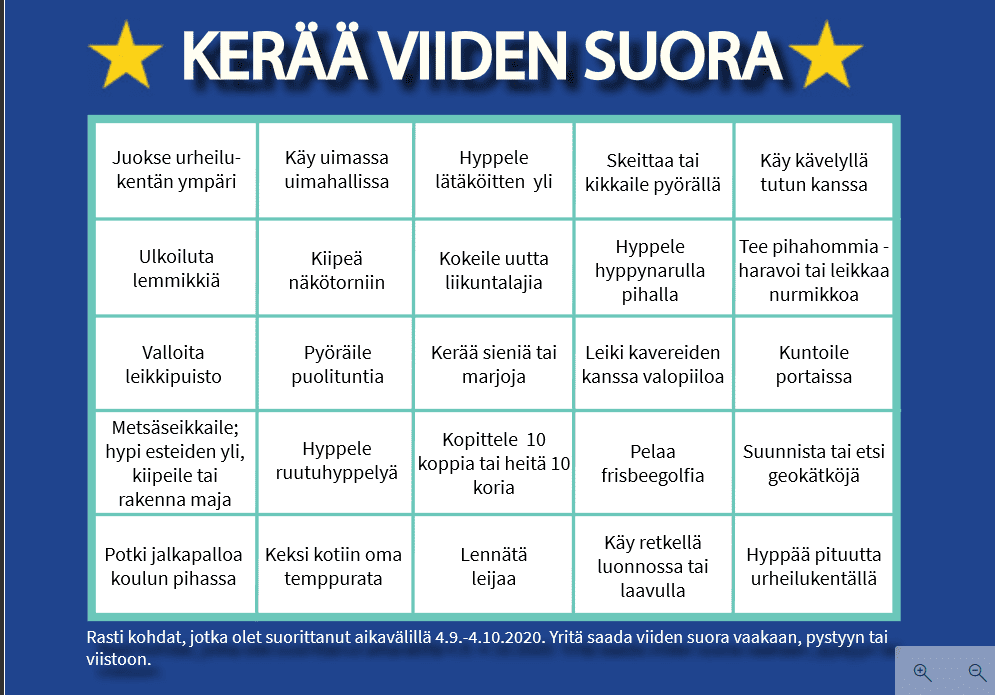 METSÄSEIKKAILE, kiipeä näkötorniin, lennätä leijaa tai leiki valopiiloa. Paavolan koulun ensimmäisen ja toisen luokan oppilaita innostetaan liikkumaan Liikunta-Aallon liikuntabingolla, jossa viiden suoran kerättyään saa Alajärven Osuuspankin sponsoroimat valkoisen ja punaisen vilkkuvalon.