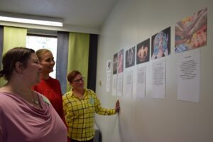 TEKSTIILITAITEILIJAT Maisa Turunen-Wiklund, Susanna Beloff ja Tuulikki Päällysaho toivat LangatON-näyttelynsä Nelimarkka-museolle. Näyttely avautuu lauantaina.