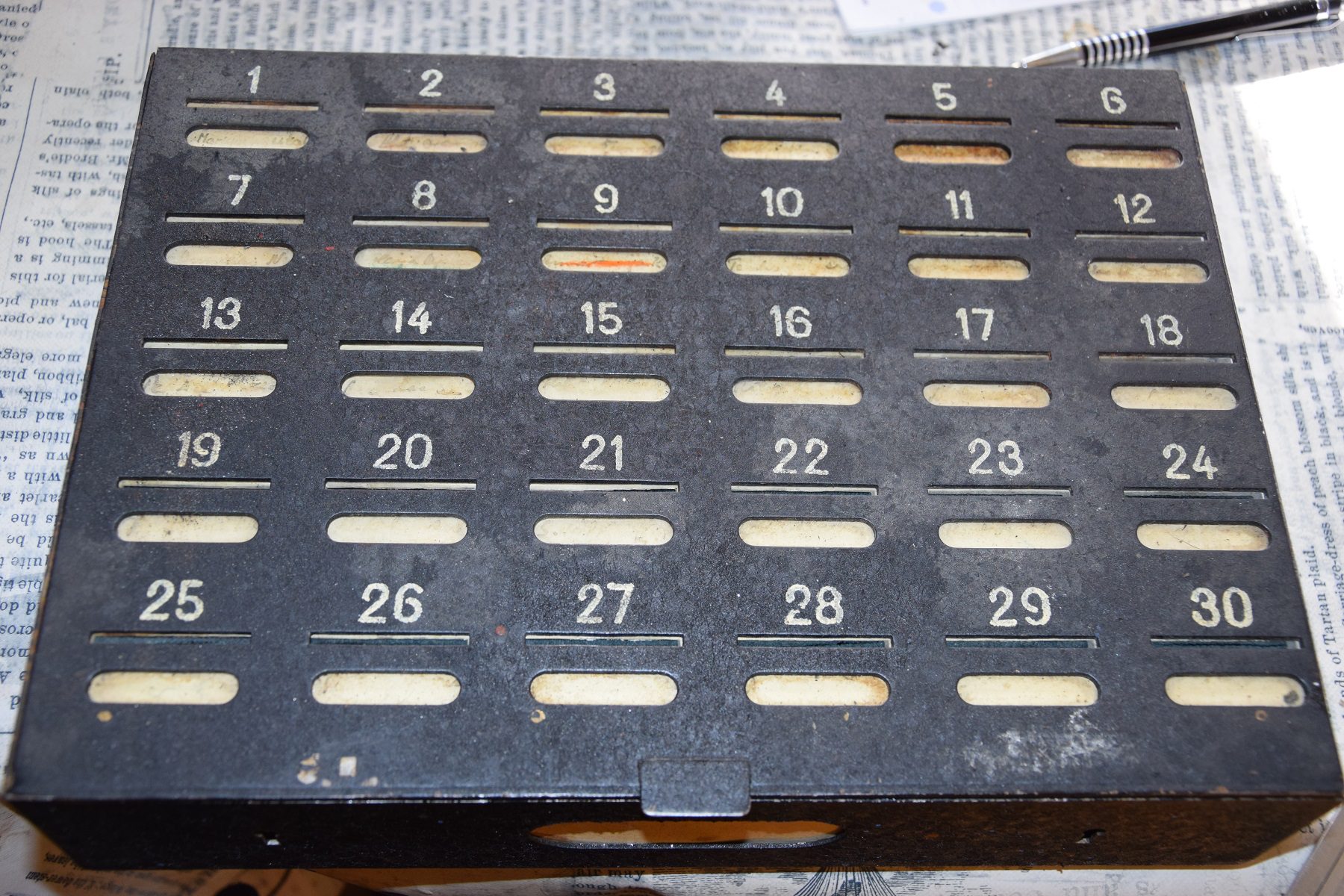 –Polkupyörät, ruohonleikkurit ja kaasugrillit ovat olleet suosikkituotteita! Olemme saaneet myös 30 henkilöautoa, ja maaseutupitäjässä kun ollaan, kolme perunapuimuria. Kolme on vielä tulossa, kunhan vilja saadaan puitua. Mukana on tullut paljon hyvää tavaraa ja mitä ihmeellisimpiäkin juttuja. Yksi erikoisuus oli 1 600 kilon sähkömoottori. Yksi helmistä on tällainen laatikko, jollainen löytyy myös Wanhojen Wehkeiden museosta, mutta kukaan ei tiedä, mikä se on, kertoi Vesala näyttäen laatikkoa, jonka kannessa on numerot 1–30, sivuilla kantokahvat ja sisällä lokerikko.