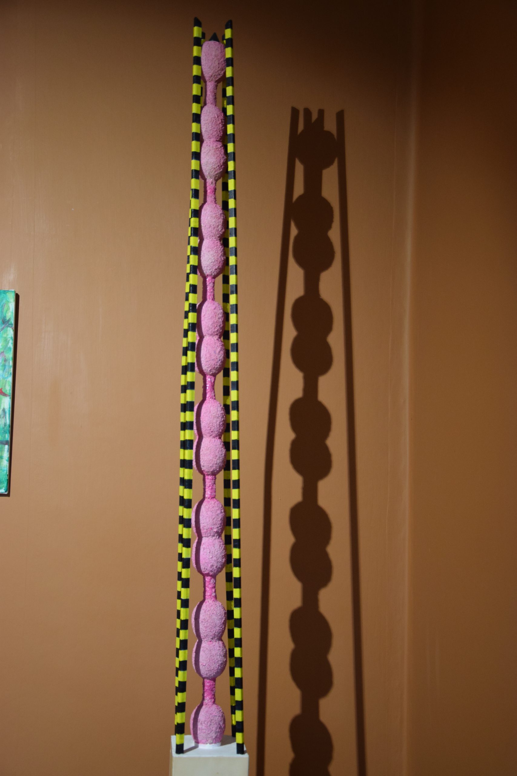 Taiteilija Tapio Hirvonen ilahtui huomatessaan, miten hänen maalaustensa värit syttyivät hehkumaan Villa Väinölän näyttelysalin oliivinvihreää seinää vasten. Kuvassa oleva teos Patikka (2021) sai nimensä taiteilijan vaellusharrastuksesta.