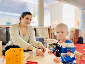 Evijärven kirkossa kaikuu iloinen puheensorina ja leikin äänet tervehtivät sisääntulijaa. Kirkon ovet ovat hetki sitten auenneet evijärveläisille perhekerholaisille, jonne lapsi voi tulla vanhemman tai vaikka isovanhemman kanssa.