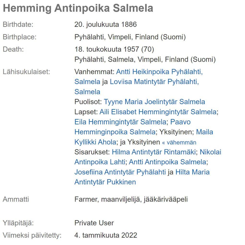 Sukututkimus on mielenkiintoista puuhaa, kirjoittaa Heikki Salmela. Tässä esivanhempien sukutaulua.