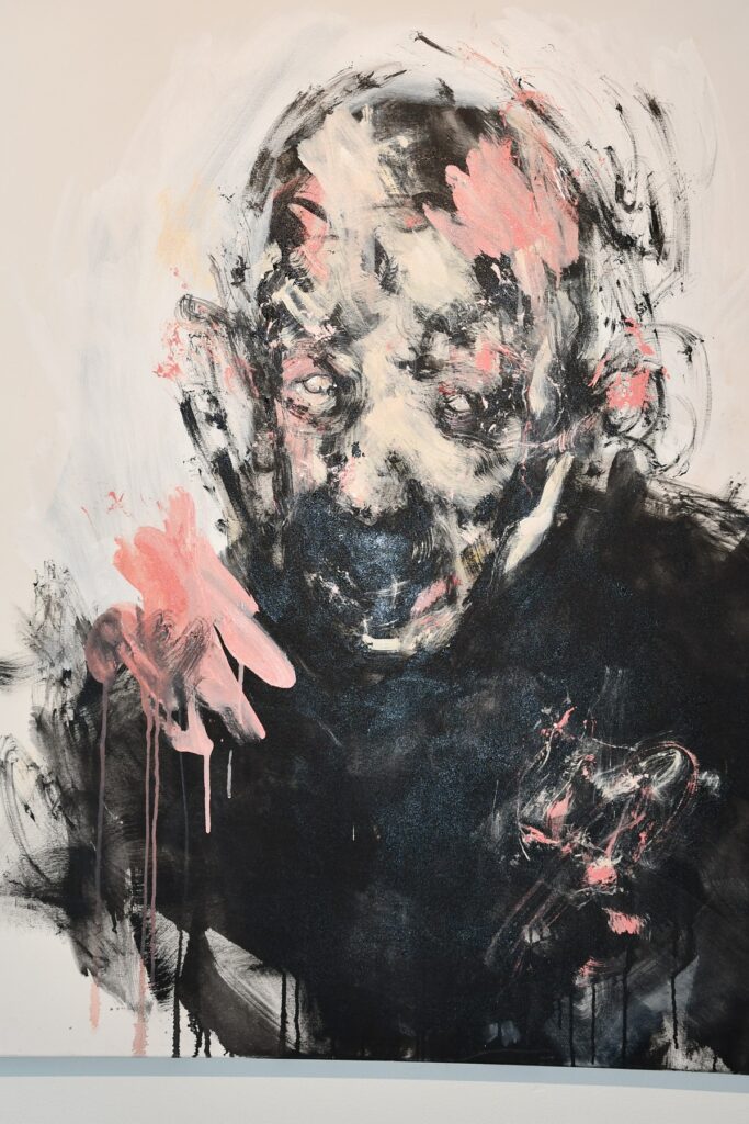 NÄYTTELYSSÄ on mukana töitä pienikokoisista omakuvateoksista suuriin, lattialla maalattuihin osin kolmiulotteisiin töihin.