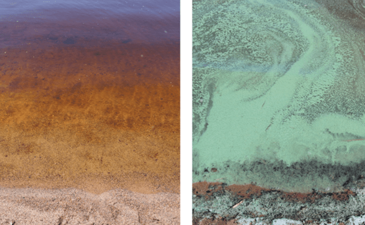 Kuvat Lappajärveltä samana päivänä järven eri rannoilta helteisellä ja tyynellä säällä. Sinilevätilanne voi vaihdella paikallisesti paljonkin. Sinileväinen ranta sijaitsee lähempänä järven tulojokea, josta kertyy rehevöittäviä ravinteita runsaammin sitä lähellä oleville rannoille lisäämään sinileväkukinnan todennäköisyyttä.