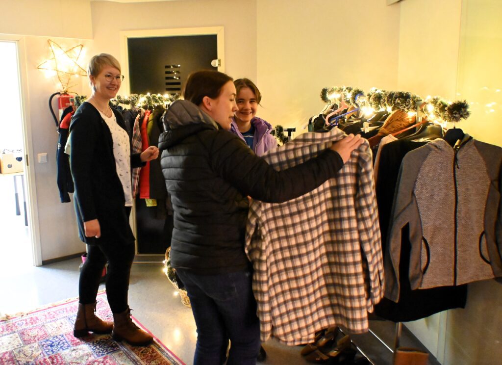 Moms for Kidsin Pop-Up Vaatepankki herätti kiinnostusta ja vapaaehtoisten piiriin löytyi myös lisää innokkaita Vaatepankkilaisia toimintaa pyörittämään. Kuvassa vasemmalla Vimpelin vaatepankkivastaava Seija Aho. Mirella ja Isla Haanpää kävivät tuomassa vaatepankille vaatetta, samalla Isla teki itselleen löytöjä.