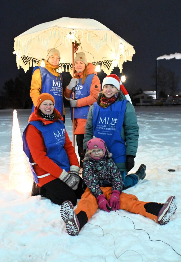 Vimpelin MLL järjesti omatoimisen tonttupolun Saarikentällä. Kuvassa seisomassa Jenna Liikala (vas.), Emmi Pippola, edessä Jaana Ylipekka (vas.) ja Silja ja Laura Sänkiaho.