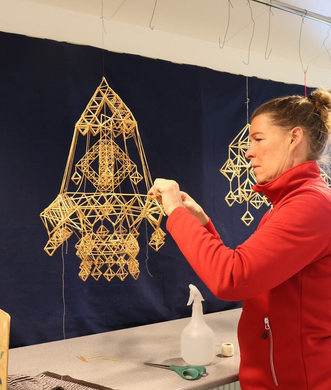 −Tällä kurssilla valmistettiin perusmuodosta rakentuvaa pyramidin muotoista olkihimmeliä ja erilaisia himmelikransseja olki- lasi- ja muovipilleistä. Kun tekniikan oppii, työtä voi jatkaa kotona. Rukiin olki on perinteinen himmelin valmistusmateriaali, mutta saatavilla olevat oljet ovat yleensä vehnää. Oljen kanssa toimiessa tarvitaan hellän napakka ote.