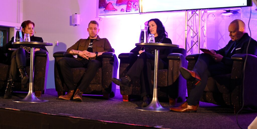 Paneelikeskustelun aiheena oli vastuullisuuden haasteet ja mahdollisuudet. Panelisteina Elina Hiltunen (vas.), Suomen Lanka Oy:n toimitusjohtaja Kimmo Angervisto, sekä Mäkelä Alun EHSQ-päällikkö Päivi Venesoja. Paneelin puheenjohtajana toimi Niko Herlin.