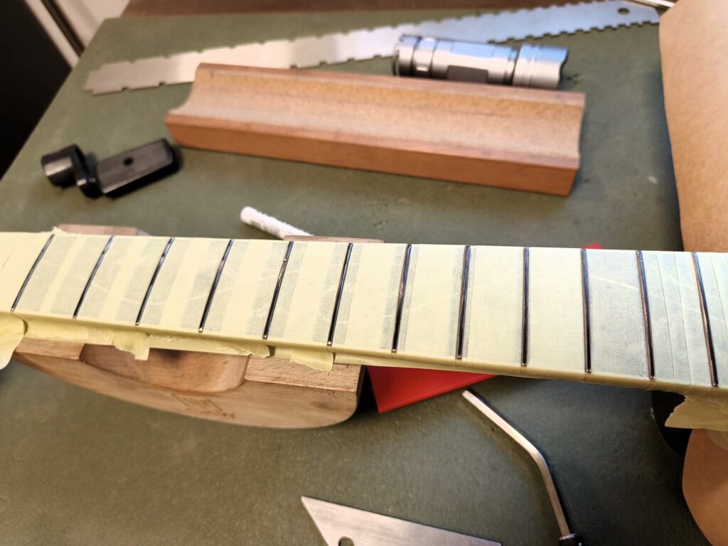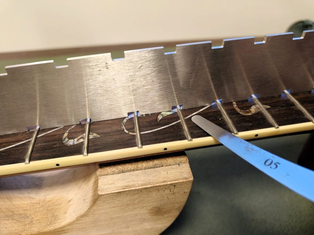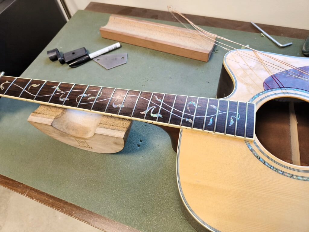 Viimeisimpänä valmistui huoltotyöt kitaralle, jossa säädettiin kaularauta, kiristettiin virittimet, tarkistettiin yksittäiset nauhat nauhatulkilla, sekä hiottiin, pyöristettiin ja kiillotettiin otenauhat.