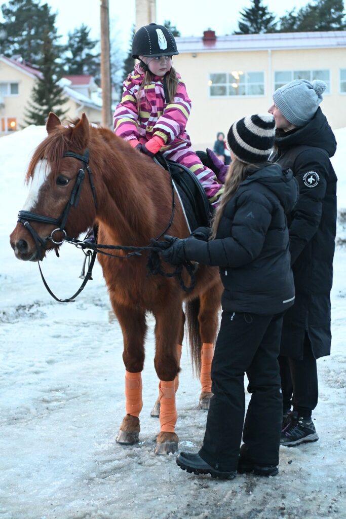 AAPISKUJAN koulun takapiha täyttyi riemunkiljahduksista ja punaisista poskista lasten jakautuessa itselleen mieluisten touhujen äärelle talviriehassa helmikuun viimeisenä iltana. Tapahtuma järjestettiin yhteistyössä kunnan ja yhdistysten kanssa. Jäädiscon menevästä musiikista jääkiekkokaukalossa vastasi Dj Tauno, kun taas viereisellä kentällä tarjosivat Heppahaaveilijat ilmaista ratsatusta. Nälkäkään ei päässyt yllättämään, kun MLL:n kioskista sai pikkurahalla suolaista ja makeaa herkkua. 4H Vimpelin yhdistystä edusti valotikkuja jakava nalle.