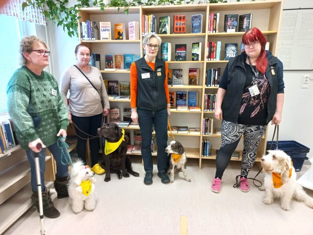 LAPPAJÄRVEN kirjaston järjestämä lukukoiratapahtuma on tuonut kirjastoon neljä koirakkoa (koiraa ohjaajineen) sekä runsaasti yleisöä. Kaksi lukukoiraa kuuntelee miltei tauotta varttitunnin mittaisia lukutuokioita, ja kaksi kaverikoiraa saavat sillä aikaa paijauksia ja rapsutuksia kirjastosalin puolella.