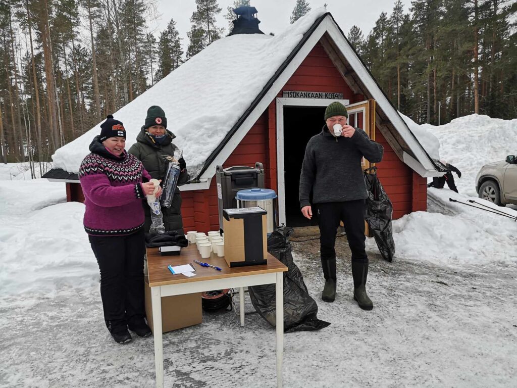 Hiihtojaoston aktiivinen porukka huolsi makkarat ja mehut. Johanna Rintala (vas.), Anu Koivisto ja Teemu Paalanen mehulla hiihtoretken päätteeksi.