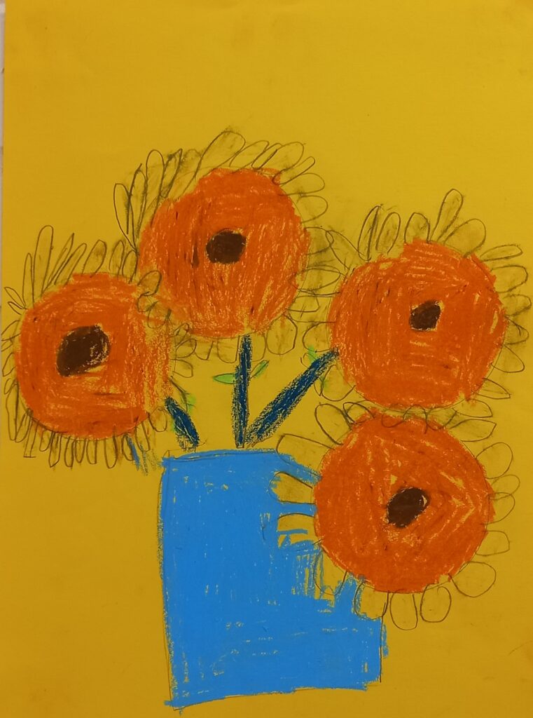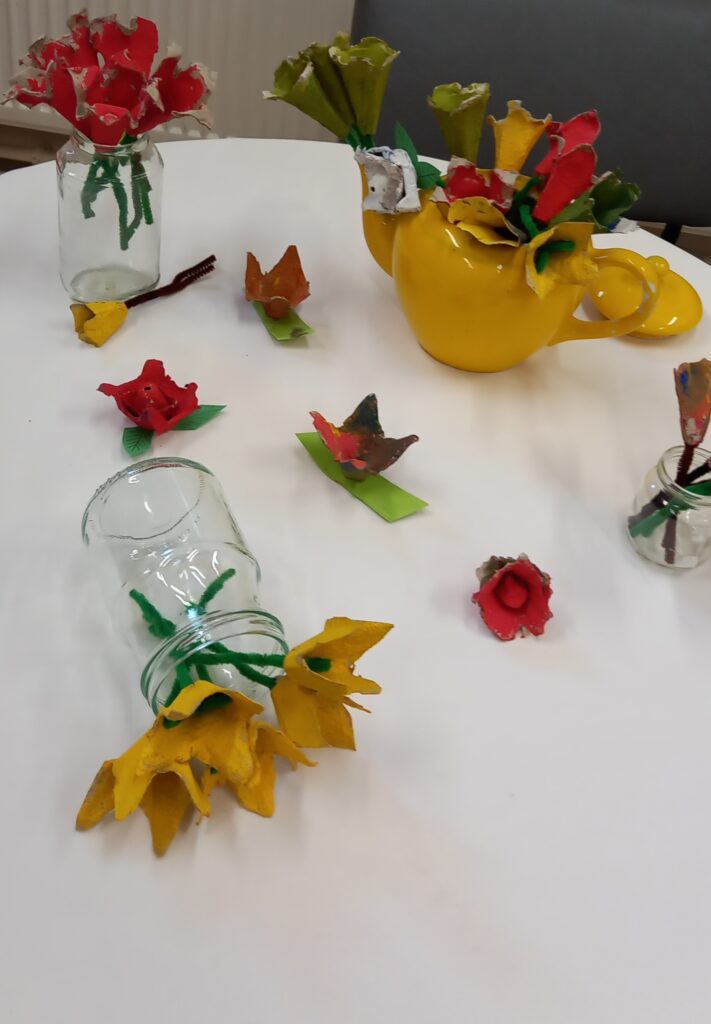 Tutkittiin taidekirjoja – taiteen historiasta sai valita mieleisensä työn ja maalata siitä mukaelman. Kevään ja pääsiäisen kunniaksi askarreltiin kukkia ja saatiin niihin mahtavat sävyt.