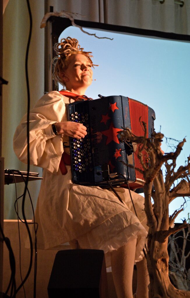 Tarinat, runot, tanssi ja liike, musiikki ja äänimaisema sekä valkokankaalle projisoidut videot yhdessä yksinkertaisen, mutta vaikuttavan lavastuksen kanssa luovat näyttämöteoksesta mieleenpainuvan kokonaisuuden. Harmonikkataiteilija Johanna Juhola luo instrumentillaan lumoavan äänimaiseman ja hetkessä syntynyt Karvalan parempi humppa kirvoittaa taitelijan soittimesta vivahteikkaan maiseman. Juhola muistelee, että kipinä musiikkiin alkoi lapsena.