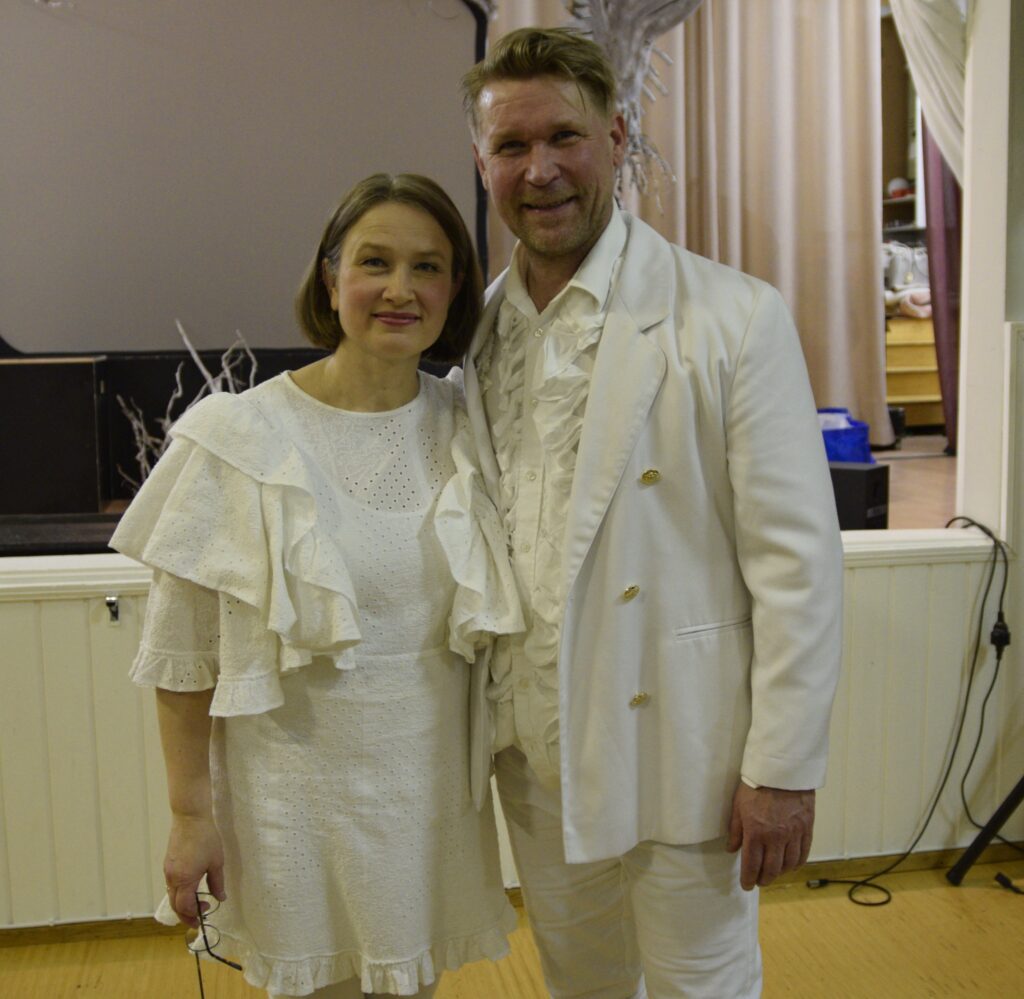 Näyttelijäpariskunta Sari Haapamäki ja Matti Ristinen rennosti esityksen jälkeen Karvalan nuorisoseuran talolla.
