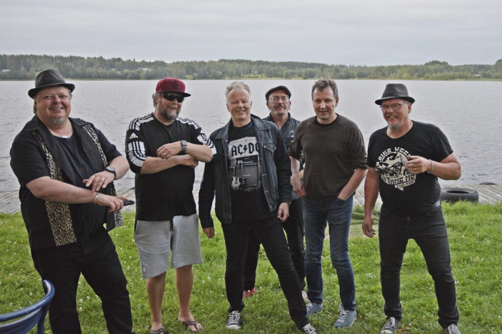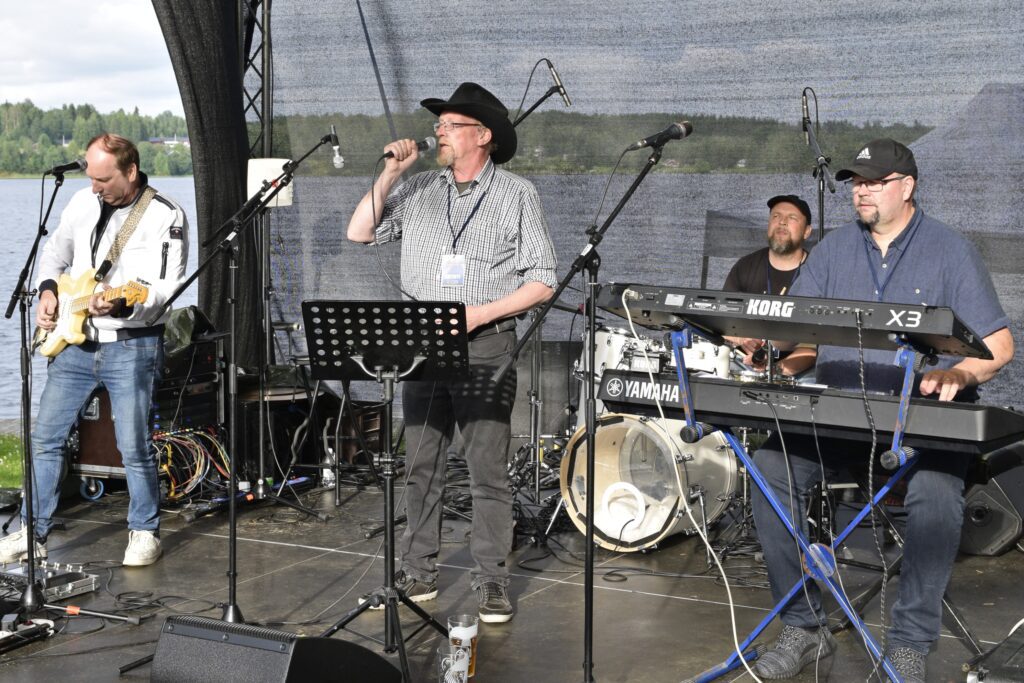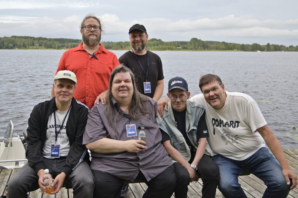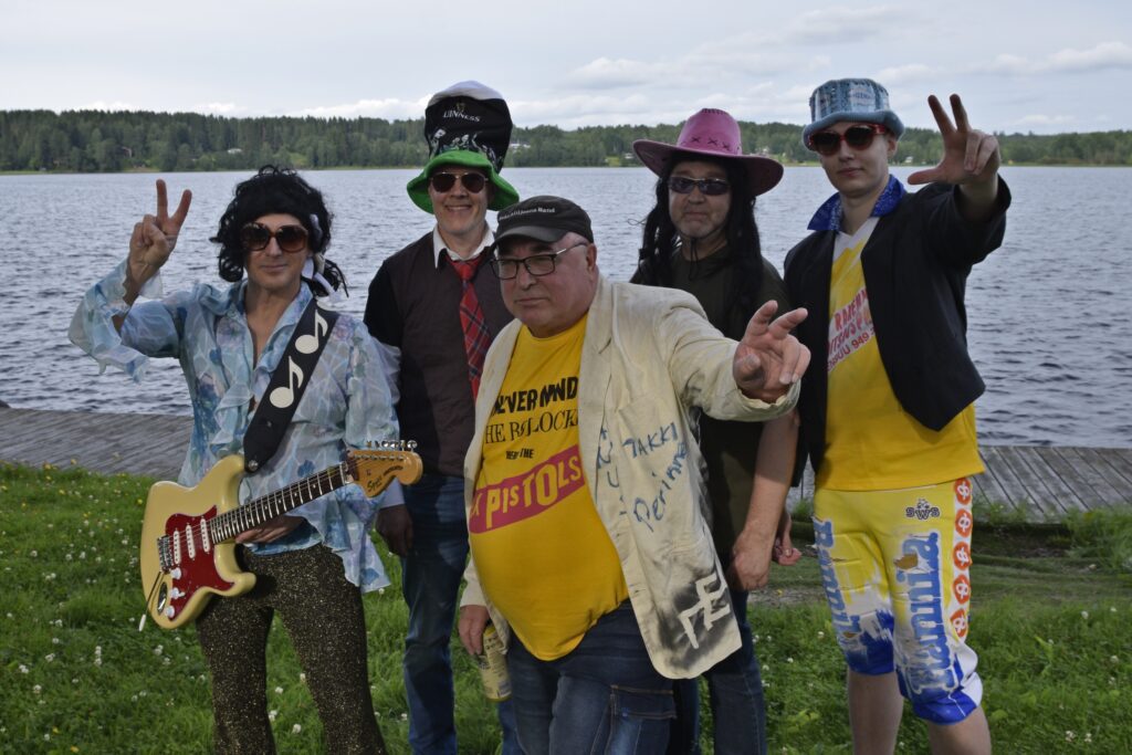 Alajärveläinen Anus Mundi soitti yhtä omaa hittiä, 20-vuotias kesähöyläpenkki -kappaletta lukuun ottamatta covereita Sleepy Sleepersiltä. Asusteet ja taiteilijanimet sopivat bändin hurttiin huumoriin ja hulvattomaan meininkiin. Vuodesta -87 lähtien soittanut bändi on keikkaillut eri kokoonpanoilla. –Kokoonpano on vaihtunut, sitä on vaihdettu ja joskus joku on lähtenyt pois kesken keikan, kertoo laulaja Iso Danny. Kitaristi Armi & Danny (vas.), kitaristi Joukonväinö, laulaja Iso Danny, rumpali Erkki Vasili ja basisti Willhearts Billhearts Mathouse. 90-luvun vaihteessa perustettu lappajärveläinen Los Bananas soittaa suomalaista rockia muun muassa Rauli Badding Somerjoelta, Kirkalta ja Juice Leskiseltä. Bändin alkuperäiskokoonpanossa soittavat veljekset Tuomo (vas.), Jouni ja Timo Övermarkin lisäksi kosketinsoittaja Anssi Timo. Lauantai-iltana rumpali Timo oli toisella keikalla ja tuuraajaksi oli saatu vimpeliläisvahvistus Tomi Havinen. Akustista folk-pop-punk-tyylistä, omia kappaleita soittava vimpeliläinen Poplarit perustettiin vuonna 1991. –Bändi syntyi kun kolme vimpeliläistä lähti opiskelemaan Jyväskylään, kertoo laulaja-lauluntekijä Mika Vanhamäki. Pääosin kesäisin keikkailevan bändin soittajat ovat opettajien poikia ja kappaleita syntyy melkein joka soittajan kädestä. Edessä Mikko Sunnari kitara (vas.), Petri Mäenpää kitara, Teemu Lehto tuuba, Mika Vanhamäki laulu, takana Juha-Matti Rautiainen basso (vas.) ja Tomi Havinen rummut. Kortesjärveläinen rockbändi Greenbeast päätti Entisten nuorten bändikatselmuksen 80-luvun hevirocktunnelmaan. Omia kappaleita soittava kokoonpano kasattiin tätä iltaa varten 30 vuoden tauon ja parien treenien jälkeen. –80-luvulla tehtiin 5 keikkaa ja 2 demoäänitystä. Ei olla keikkailtu sen jälkeen yhdessä, vaikka kaikki harrastaa musiikkia eri kokoonpanoissa, kertoo laulaja Tapio Salo. Seppo Nuolikoski koskettimet (vas.), Pauli Lähdemäki basso, Pasi Lähdemäki kitara, Jarkko Mattila rummut, Hannu Pellinen kitara ja Tapio Salo laulu.