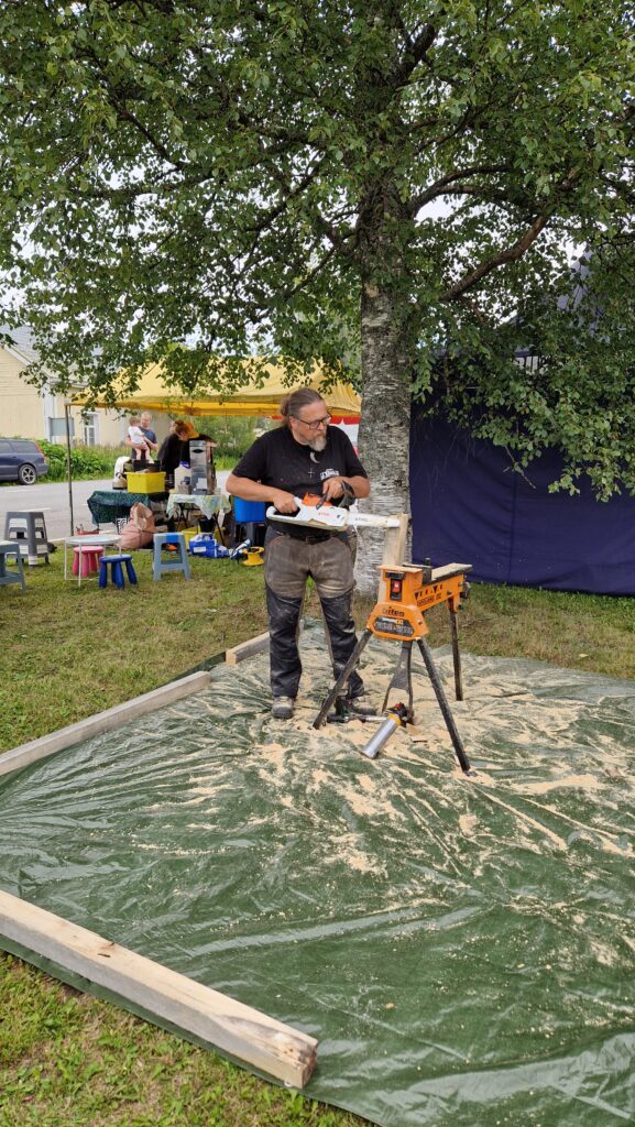Markkinatunnelmissa oli monenlaista mukavaa. Jo ensimmäisellä tunnilla väkeä oli mukavan oloisesti paikalla. Puuta veisteltiin, tarpeellista tavaraa oli kaupan maan antimista leipomuksiin ja rännikouruihin saakka. Puuartisti Juha Käkelä saapui Sääksjärvelle Ylöjärveltä. Käkelä antoi puuveistokselleen väriä pienellä kaasutoholla ja ehti muutaman sanankin vaihtaa.