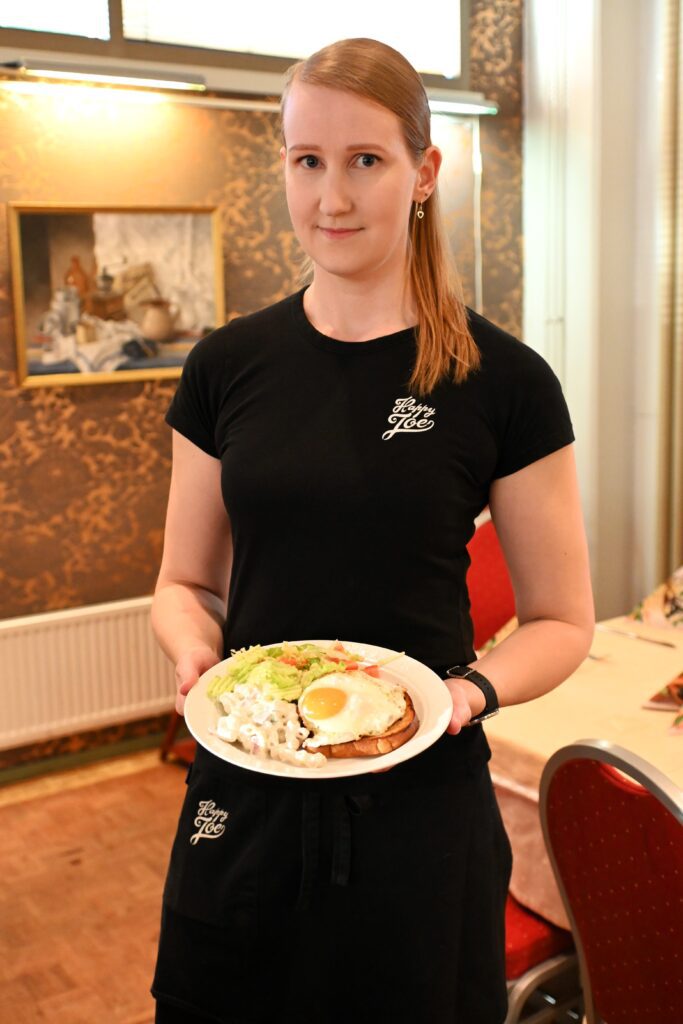 Ravintola Tuuhetin oopperaleipiä myytiin illan aikana 80 kappaletta. Kuvassa Taru Furu ja herkullinen oopperaleipä salaatteineen.