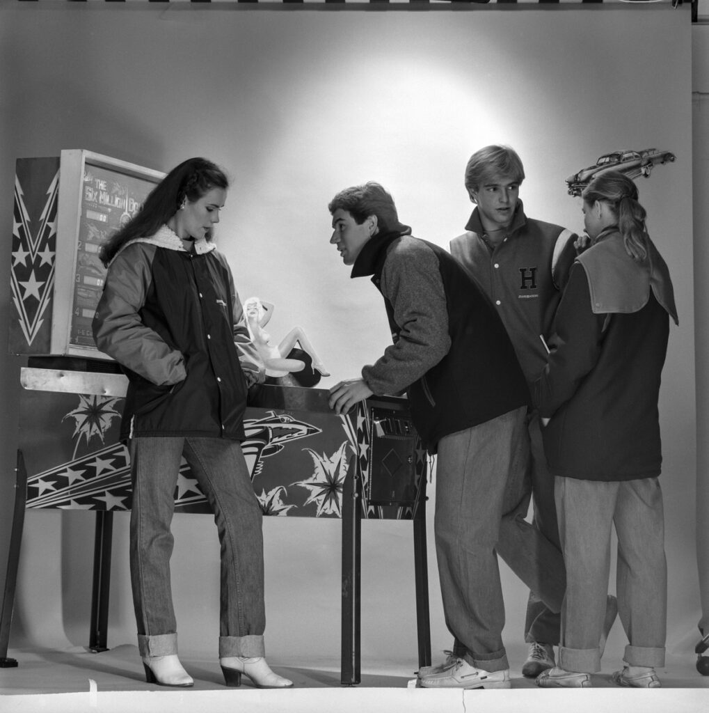 Flipperiä pelattiin ahkerasti. Särkikylän baarissa oli viikoittainen kilpailu ja parhaan tuloksen pelannut sai palkinnon. Kuvassa olevien henkilötietoja ei ole saatavilla mutta pukeutuminen kuvaa 1970-luvun nuorten tyyliä. Kuva: Museovirasto.