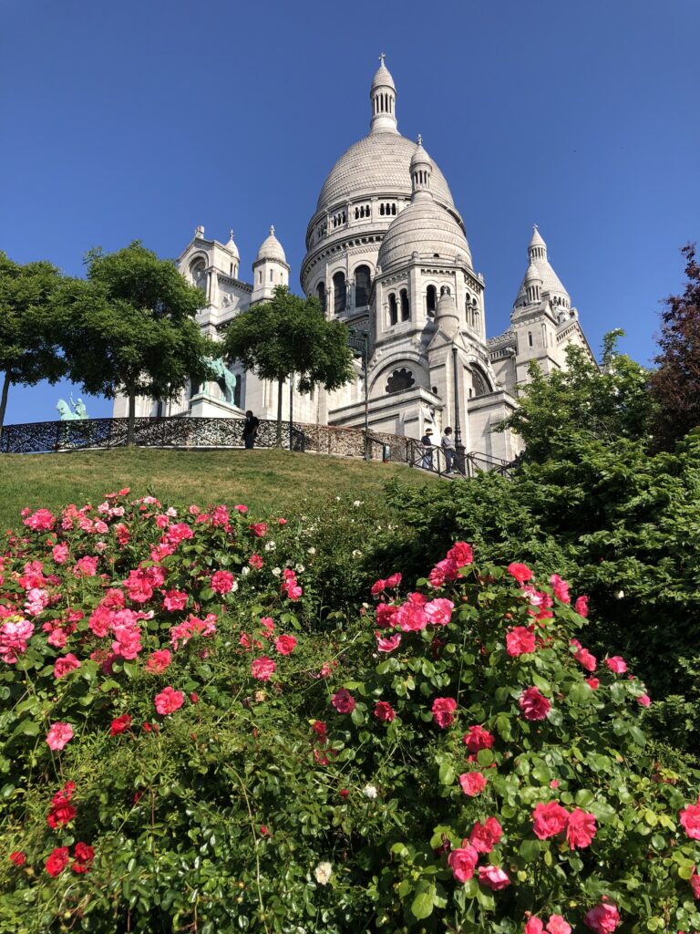 Pariisin korkeimmalle kukkulalle nousimme funikulaarilla eli kiskoköysiradalla. Yksi matkailijoista harrasti porraskävelyä ja hän reippaili portaat ylös, kuten joka päivä hotellin viidenteen kerrokseenkin. Montmartrelle riitti askelmia ja 150 jälkeen hän oli lakannut niitä laskemasta. Kukkulalla vierailimme ensin upeassa Sacre Coeurin basiliskissa. Katolinen kirkko on yksi Pariisin suosituimpia turistikohteita. Turisteista huolimatta, kirkon suitsukkeen tuoksuinen pyhä tunnelma sai mielen hiljenemään ja huomion vaikuttaviin seinä- ja lasimaalauksiin, patsaisiin ja koristuksiin. Kirkossa olisi voinut viipyä pidempäänkin, siellä vallinnut harras tunnelma sai silmäkulmat kostumaan. Kirkon jälkeen kiertelimme idyllisen kaupunginosan katuja ja vierailimme lukuisissa turistikaupoissa, joista jokainen taisi löytää tarvittavat tuliaiset läheisilleen.