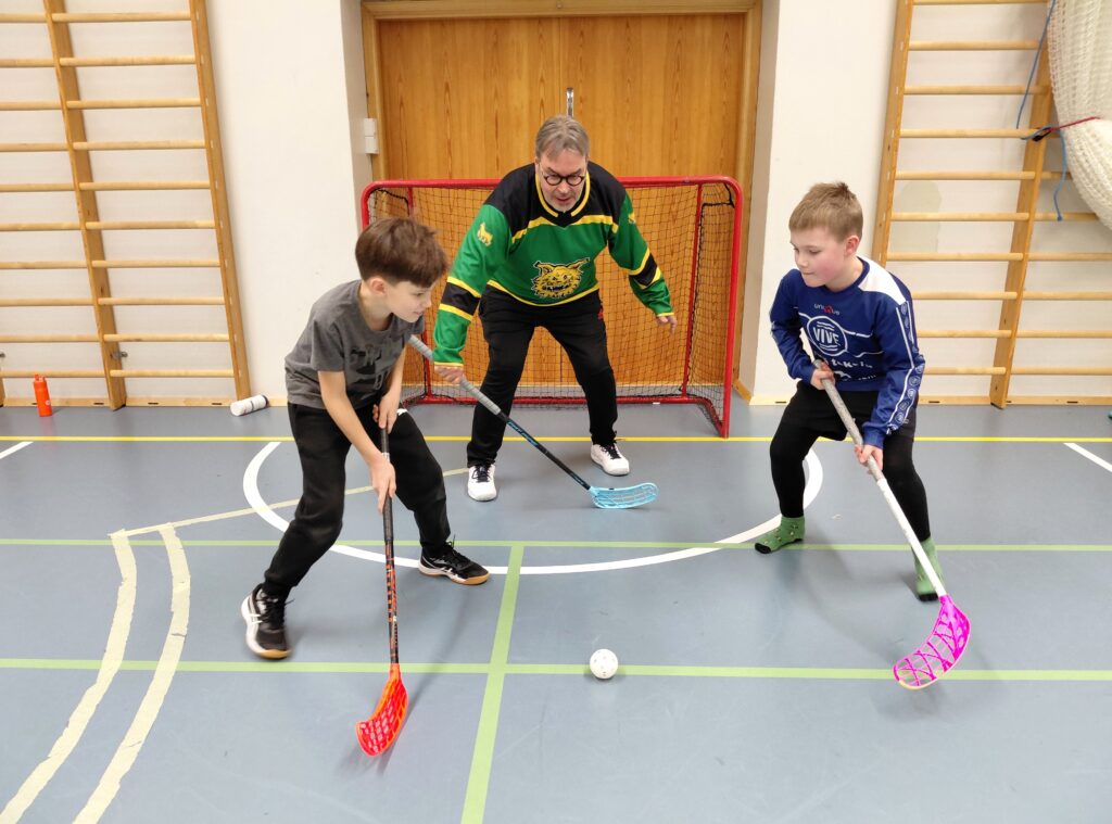Sählykerhossa riittää vauhdikkaita tilanteita. Timo Turpela maalissa, Miika (vas.) ja Kaius mittelevät pallosta.